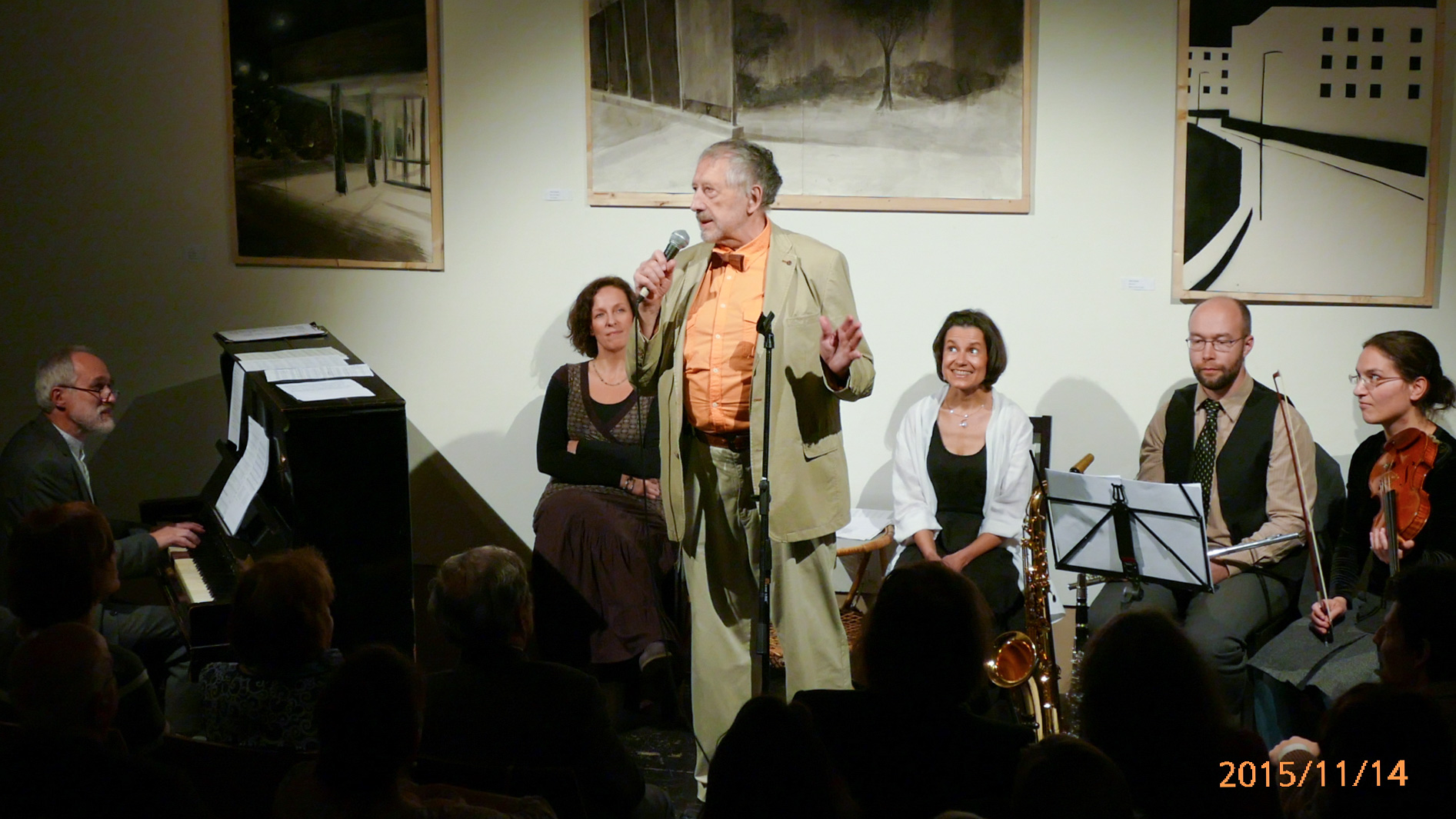 Jan Vodňanský (stojící) zpívá na svatbě Přemysla Ruta (u klavíru) a Markéty Potužákové (čtvrtá zleva) v Divadle Na prádle 14. 11. 2015. Foto Bohdan Holomíček.