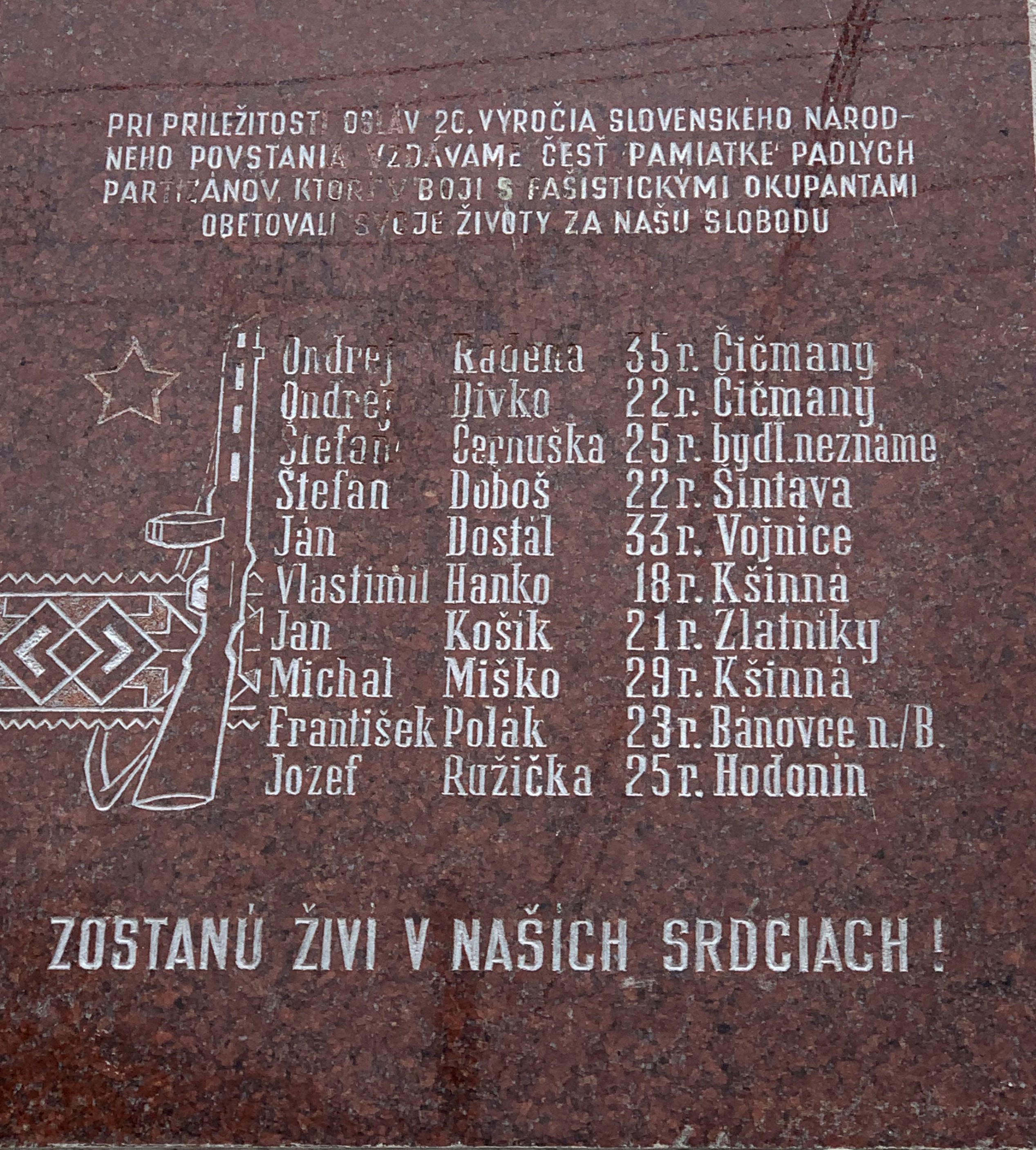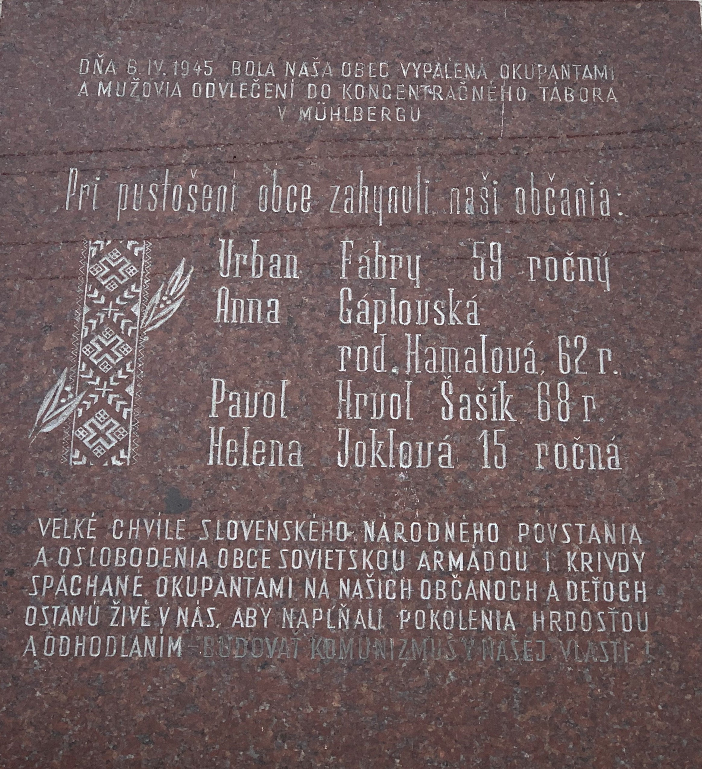 "Otecko bol v koncentráku a to sme ani nevedeli. To už bola doba, 8. mája skončila vojna a vrátili sa až 11.júla. Aj sme sa dotazovali, pýtali ľudí, čo boli v koncentráku. Nikto nič o Čičmancoch nevedel, ani šuchu. Až naraz jedného krásneho dňa prišli takí mladí chlapci, čo boli zdatnejší prišli od Zliechova a od Ilavy pešo. Ani sme nevedeli, len naraz prišli, ako by z holého neba spadli. To bolo radosti vtedy, si spomínam!"