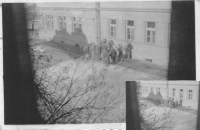 The arrested students from Chotěboř stacking wood in the prison of the Chotěboř court, assisted by armed prison guar. Photo taken from the attic of the Brychts´ house in January 1949, Michaela Dostálová Frühbauerová´s private archive