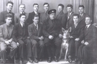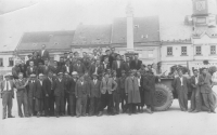 A group photo of new tractor drivers. They successfully passed a driving test and Jiří Boháč therefore could work not only as an auxiliary worker but as a proper tractor driver in the machine tractor station in Malče. The square in Chotěboř in May 1949. Jiři Boháč wearing a black jacket is on the right in the second row just behind the tractor wheels