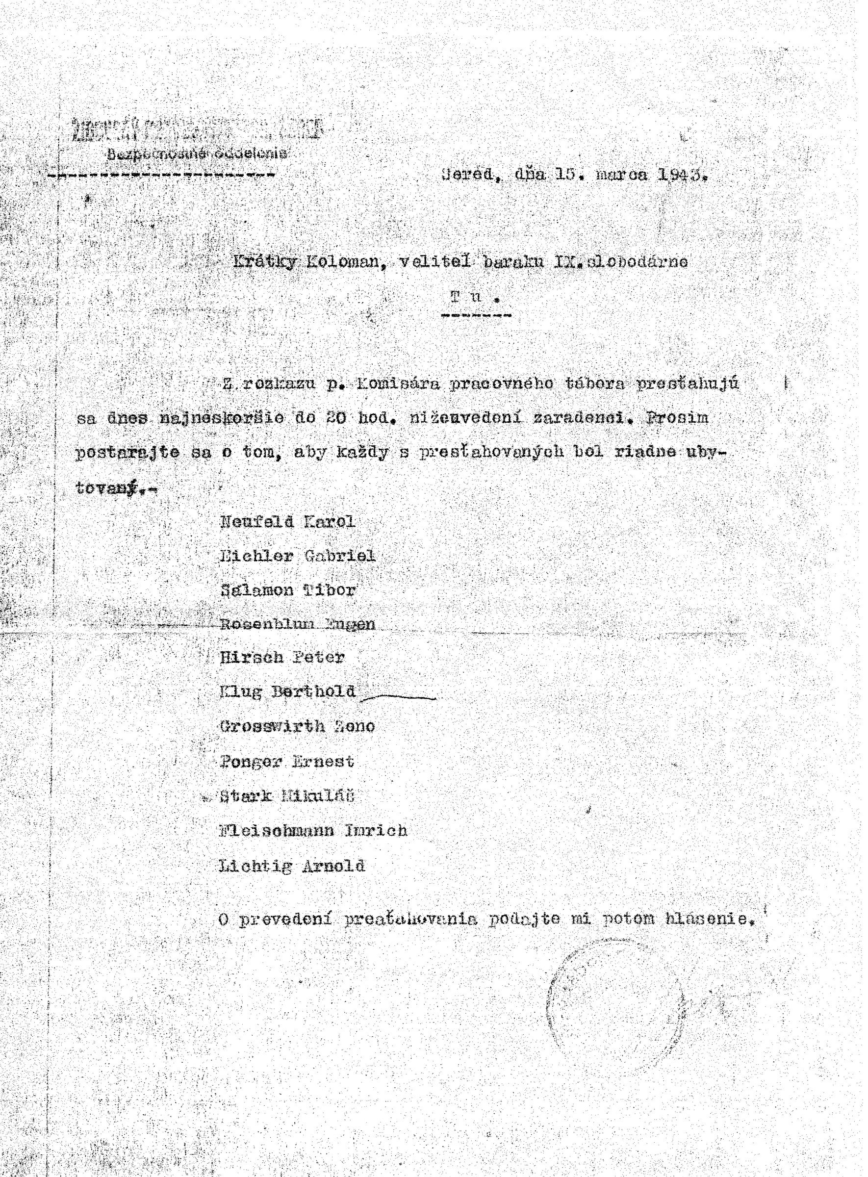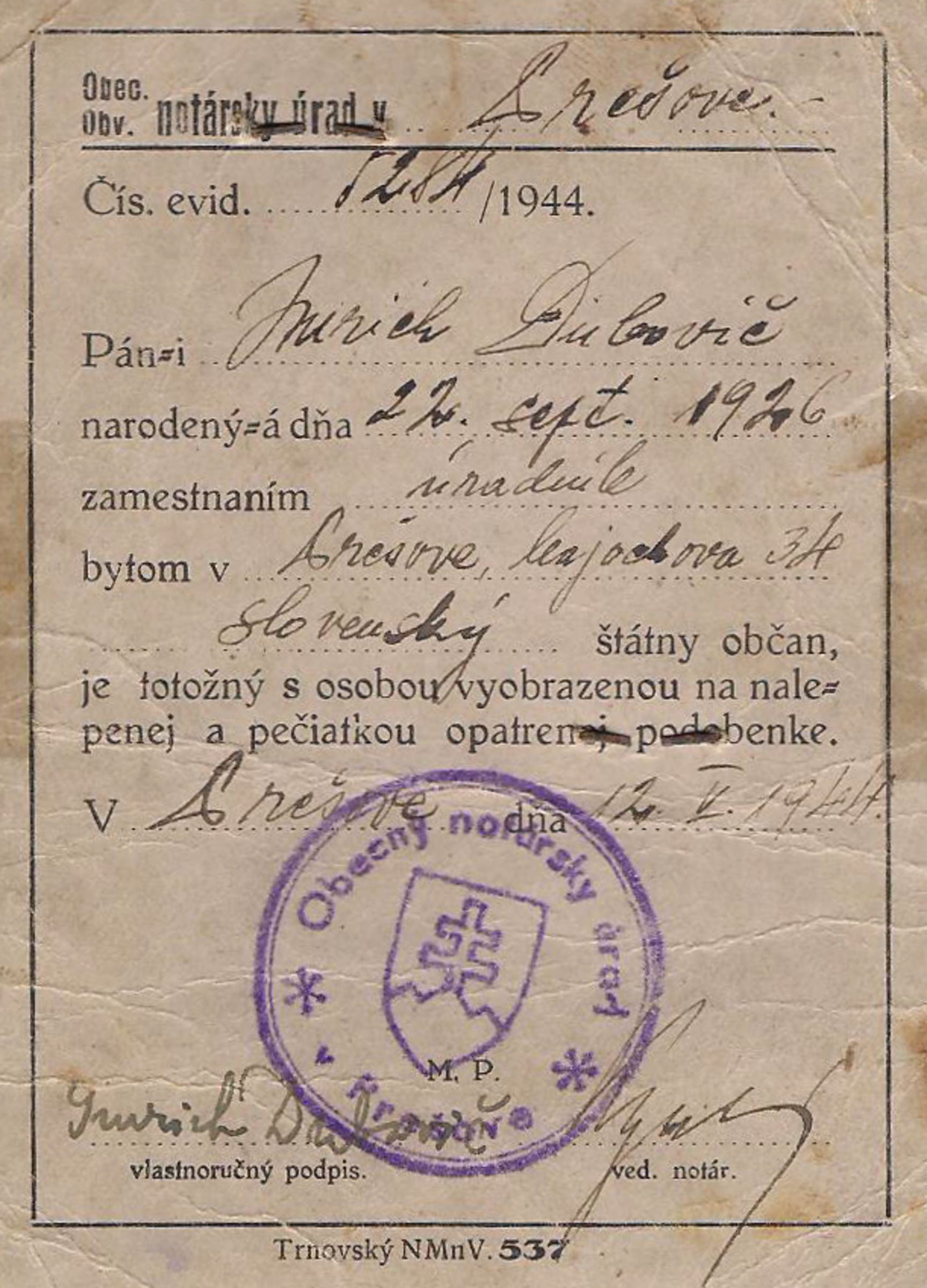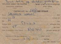 Šmuel Givoni was born as Tibor Salamon on June 30, 1923 in Pressburg family of a tradesman with clothing and brides‘ trousseau. He attended the elementary school in Bratislava, where he had many Slovak friends. He was also a swimmer in Jewish swim club Bar Kochba located in Grössling Spa. After the establishment of Slovak State, Šmuel had to stop attending the club as well as school and his father signed him up for vocational study to become a plumber. When his father died, the family business was aryanized and Šmuel and his mom lost their housing. Within the forced labor, Šmuel found out about the plan to build a labor camp in Sereď and he voluntarily joined the works. During the first wave of deportations he worked at the camp as the head of plumbing and became a member of the underground movement Collectiva. Later, together with other members of the movement he took part in battles within the Slovak National Uprising and after its crushing, he returned back to Bratislava, to be able to work in the underground movement. Unfortunately, his activity was revealed, he was arrested and repeatedly deported to Sereď. After the camp‘s liquidation, during the transport to Theresienstadt he jumped out of the train. Shortly after the war, in 1947 he illegally emigrated to Israel, where he helped to found kibbutz Shomrat, where he also lived at the time of the documentation.