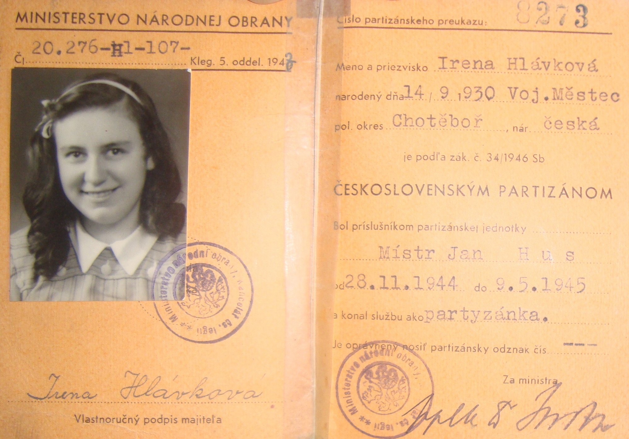 Irena Hrbáčková, née Hlávková, was born on September 14, 1930 in Vojnův Městec in the region of Vysočina in what was then Czechoslovakia. She grew up in Račíně, where she completed elementary school and then went on to study a municipal secondary school. This was already at the time of the war. On October 26, 1944, the airborne guerilla brigade „Mistr Jan Hus“ was landed on the territory of the Protectorate. Its commander was Alexander Fomin. Irena‘s father Viktor and her brother Miroslav joined the guerillas and they provided the partisans with accommodation at their house. Later, the whole family of Irena left the house and followed the guerillas to the forests because they were afraid of German reprisals. Little Irena and her mother thus went wandering through the woods. They stayed over at some of the villages they crossed and helped the partisans with cooking food and the preparation of packs with medicaments. After the war was over, Irena Hrbáčková finished her secondary education and then went for an apprenticeship in the Moravolen in the Šumpersko region, where she subsequently worked in the Research Institute of Bast Fiber. In 1951, she married an army signalman and due to the character of her husband‘s profession, they were on the road quite frequently. She thus gradually lived in Nové Mesto nad Váhom, in Znojmo, in Havlíčkův Brod, in Tábor and in Písek. In the last two of the places, she worked alongside her husband as a signalwoman for the army, serving in a military telephone switchboard office. She presently lives in Písek.