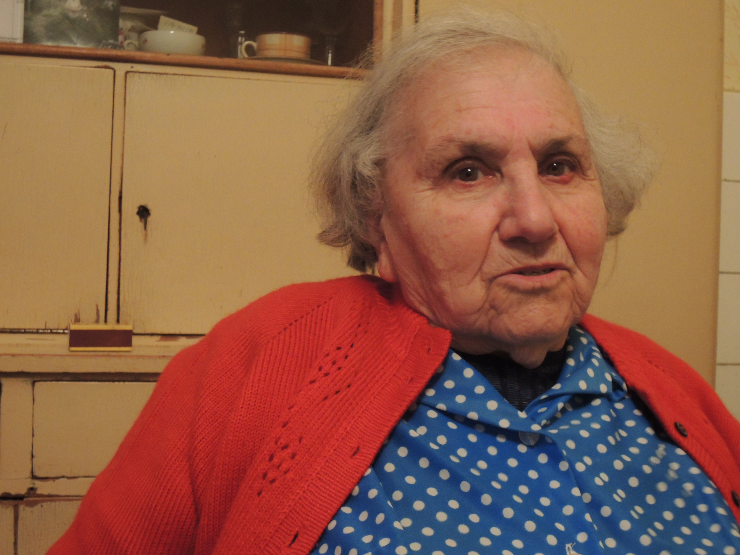 “We were in the Familienlager, which was for the men and women, the families from Terezín. And they were all gassed. A few of us survived in the hospital. Perhaps ten, fifteen... 60178 [pointing to a number tattooed onto her forearm], and the others, they did it over here, they numbered them here. Just our one had it here [on the outer side of the forearm]. Well, it’s a miracle I came back, truly a miracle, there’s no other way... Because if I had been, I don’t know if it was the same one, the dunces started bombing it, right into the prison camp, we were in this one tiny bunker there, just a few of us... I don’t know, ten... A bomb landed just as far as it is from here to the hallway. Right in front of where we lived. Well, it didn’t explode. If it had exploded, that would’ve been the end. And... it was awful, it was one thing after another.”