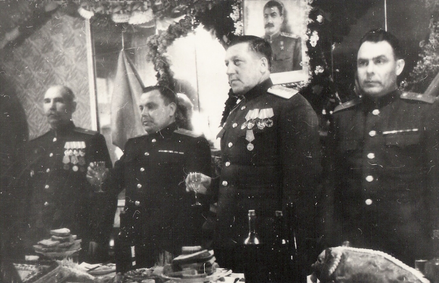 Vpravo Leonid Brežněv s velením 18. armády generálplukovníka A. J. Gastiloviče při oslavě konce druhé světové války v zrcadlovém salónku v hotelu Lichtág (dnes hotel Pivovar), Polička, 12. května 1945