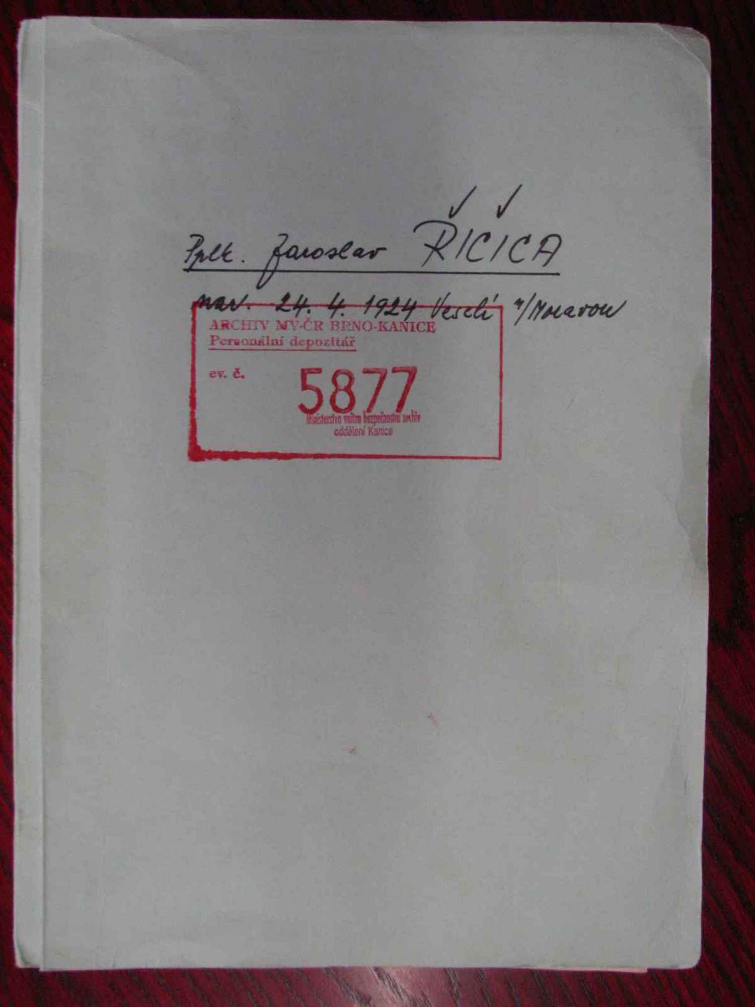 Jaroslav Řičica is a retired captain. He was born on 24. April 1924 in Veselí nad Moravou, became a machine locksmith in ČKD Sokolovo. In 1944 he was assigned to work for the Reich (total einsatz). After the war he earned his living as a laborer and in 1947 he joined the army to serve his duty. At that time he kind of „became politically wise“ and applied for a Communistic party membership. He chose to stay in the army and after February 1948 he manifested his loyalty to the party and the government as an interrogating officer in 5. Department of The Defense Ministry. Among others he also interrogated a WWII veteran Tomáš Sedláček. Tomáš Sedláček claims he was physically abused during the interrogation. After 1989 he raised charges against Jaroslav Řičica. Investigation of the case was concluded prematurely though, because a presidential amnesty from the year 1960 could be applied on it.