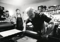 “First I did black and white lithography, later I moved to multicolor prints. There was always suspense in the creative process and the way from the original sketch to the final printout is veiled by a great mystery. The lithographic colors are transparent and so when printing in four or five, tones emerge by colors being printed one over another. My distinctive expression emerged thanks to the fact that when I did a landscape, a figure was creeping into it. I used my imagination and created compositions while being fascinated by the spiral. Natural themes in my method came out differently than during my studies. Second of all, it is thanks to lithography as a technique. When I grab a pen, my handwriting is never as distinct as when I take a stone and talk to it. The legendary pressman Václav Vejvoda used to say that stones have a soul and I have to agree with him: the stone really is a peculiar material. At the beginning I am nervous in its presence, almost fearing to make the first stroke but then a dialog starts unwinding between us – and sometimes the stone helps me out. For instance when ink is drying out and is well diluted, it creates a structure which seems random but I already know to work with such effects. I call my method regulated coincidence. I draw the coincidence’s hand but I never know what will the print look like; I let the result surprise me.”