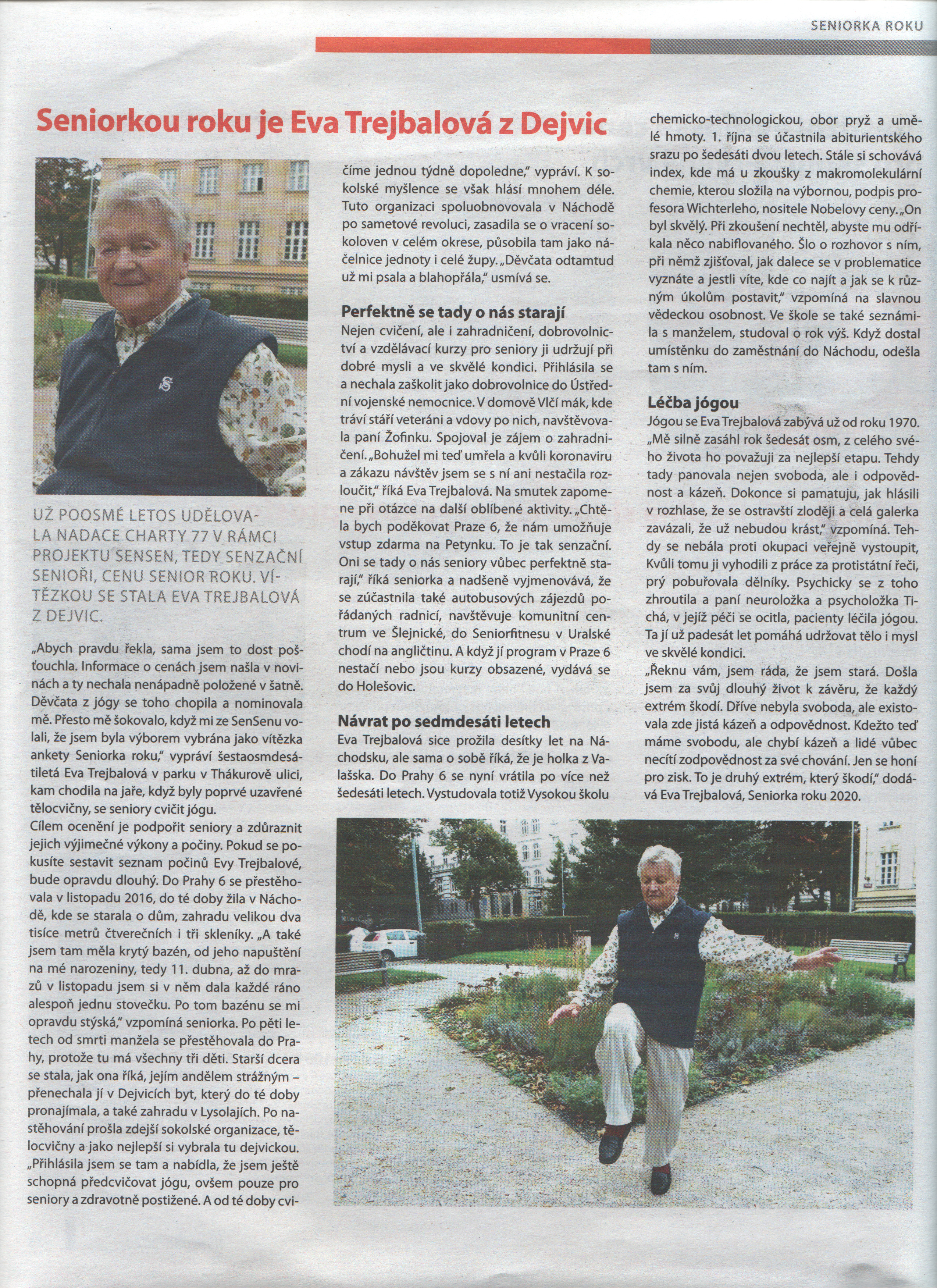 Eva Trejbalová was born on April 11, 1934 in Zlín. Her father was a civil engineer, who built several well-known road constructions in Moravia. Eva graduated from a grammar school in Valašské Meziříčí. In 1957 she graduated from the University of Chemical Technology in Prague, majoring in rubber and plastics. She was a student of prof. Otto Wichterle. She joined the Communist Party (KSČ). She married Ing. Trejbal, a classmate from the Institute of Chemical Technology and later a researcher in the field of synthetic rubber. They raised three children together. She spent most of her life in Náchod. After the August occupation of 1968, she left the Communist Party. She lost her job as part of standardization inspections and subsequently could not work in the field for seven years. She co-founded the Civic Forum in Náchod. In 2012, she received the Award for Contribution in the Field of Sport for the renovation of Sokol. In 2020, she received the title of Senior of the Year of the Czech Republic. During the period of totalitarianism, the Communists persecuted their entire family, including children.
