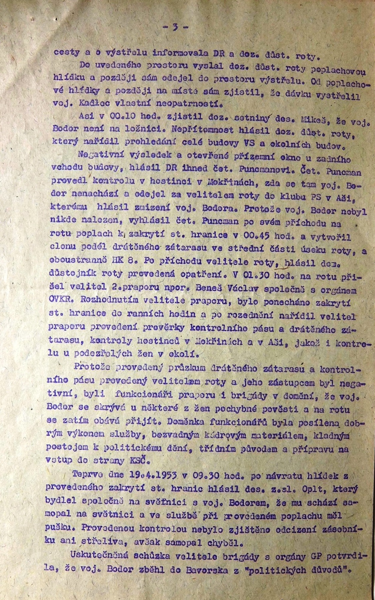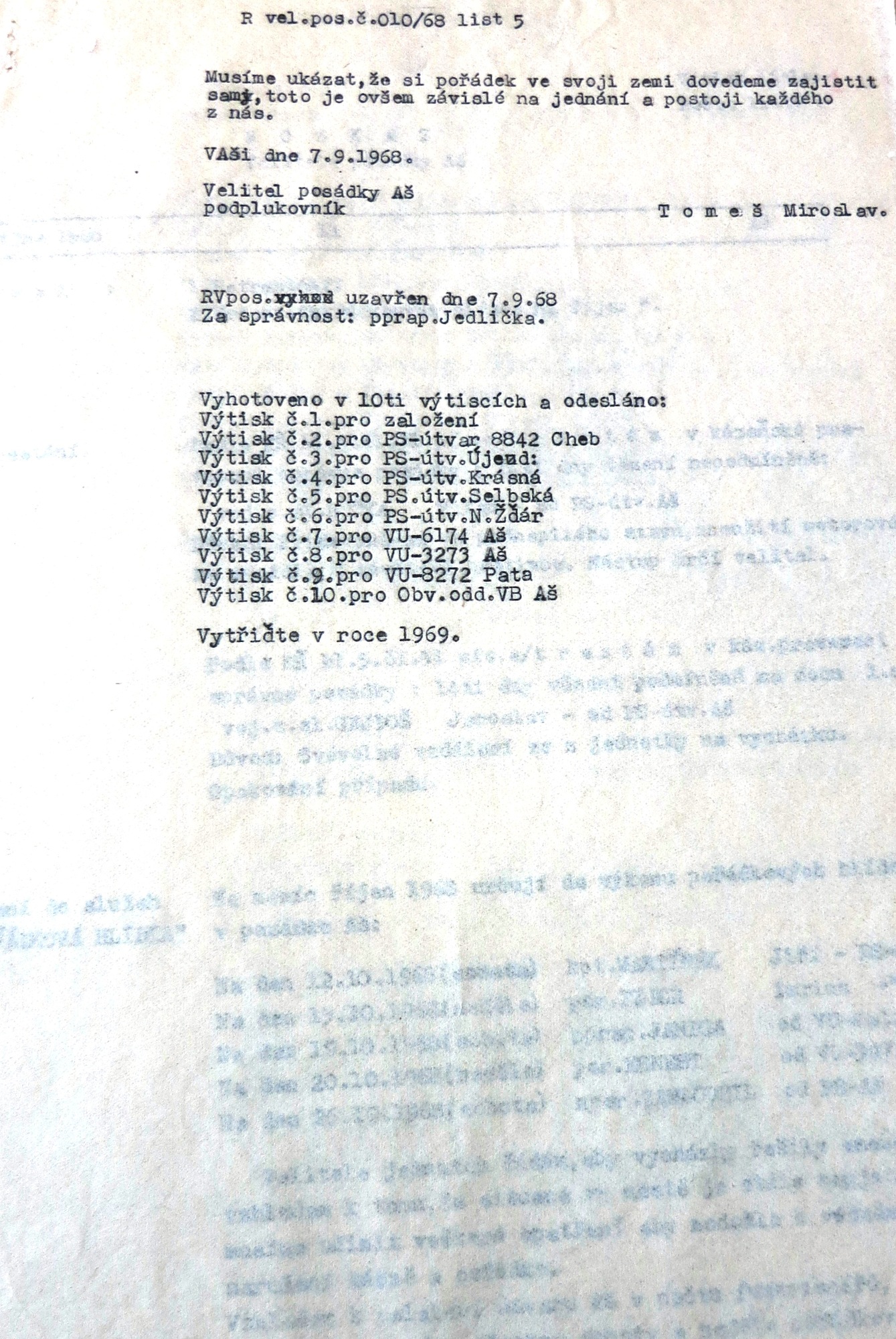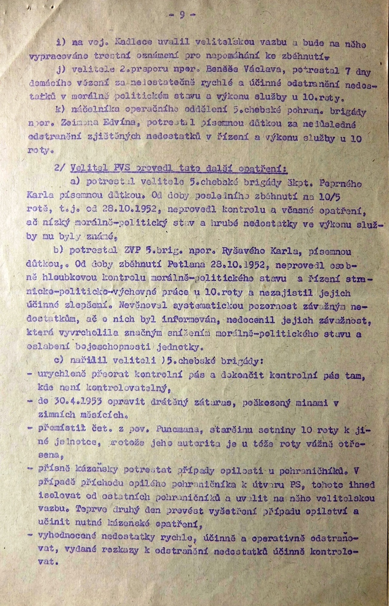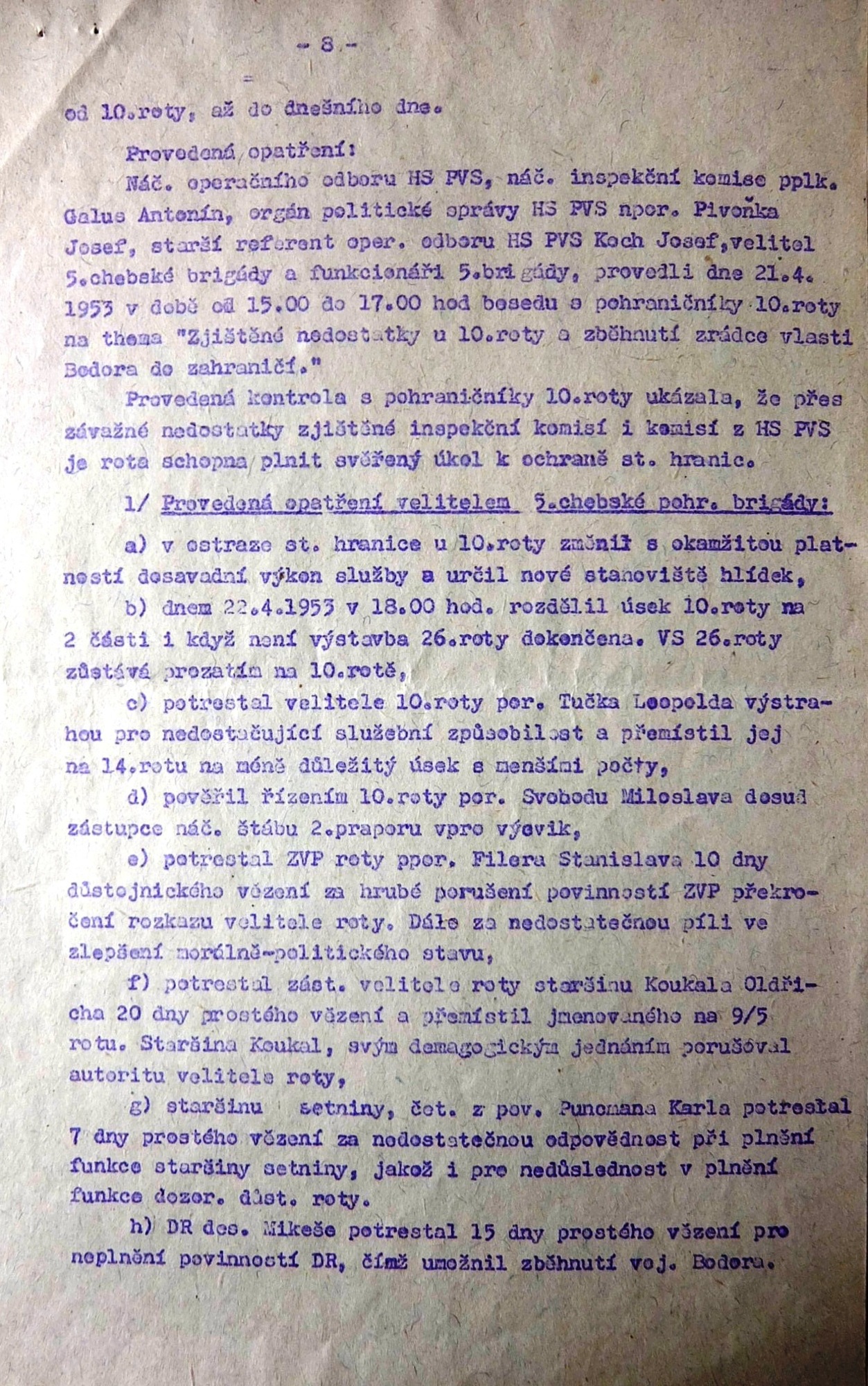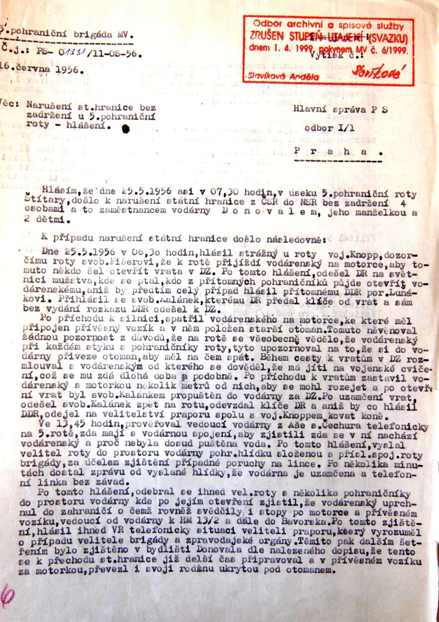 Leopold Tuček was born on 20 January 1928 in the little Moravian town of Lanžhot. His father was a blacksmith, and in 1933 he found employment in Hrušovany nad Jeviškou, heading a repair shop at the local train station. When the border regions were annexed by Nazi Germany, the whole family returned to Lanžhot. During the war Leopold finished town school and began an apprenticeship at the carpenter firm Hoffer. In 1944-5 he was sent to forced labour near Napajedla (with a short stop in the New Town of Vienna), and he took part in digging trenches in defence against the Red Army. In February 1945 he and other men attempted to escape, but they were betrayed and the Germans arrested the whole group. A month later he was more successful; he then hid in his native Lanžhot until the front arrived. He experienced the pitched battle for the liberation of the town. With the war over and influenced by a local family, the Babiňaks, who were active in both domestic and foreign resistance, Leopold Tuček joined the Czechoslovak National Socialist Party. A year later he participated in the national party conference in Prague. That same year he completed his apprenticeship at the Valtice firm Ševčík, and with the help of the chairman of the Local National Committee, he joined the National Defence Corps (NDC, the state police). In 1949 Leopold Tuček was drafted for compulsory military service. At first he served in Bruntál at the 2nd Artillery Regiment, but as a member of the NDC he was soon transferred to the border guard sections. In autumn 1949 his squad was sent to Hazlov in the Aš District (the westernmost tip of the country). After undergoing a course for physical training officers in Prague, he served the company in Libá. In the summer of 1951 the border sections of the NDC were reorganised into the Border Guard (BG). In 1951-2 the witness attended the military vocational school of the Border Guard in Prague. He attained the rank of Staršina (Sergeant Major) and took command of the company in Nový Žďár near Aš. Shortly thereafter, the barber Bodor, a seemingly firm comrade, but apparently in fact an agent of the CIC, deserted from his company and escaped into West Germany. The escapee then talked of his service in Radio Free Europe, and mentioned his commander, Leopold Tuček, by name. This „interest from the other“ brought Tuček a relocation to the border with East Germany. Here he served as company commander in Dolní and Horní Paseky. He subsequently attended a school for mid-level commanders in Bruntál. At the rank of Captain he then served at BG boot camps in Vojtanov, Cheb and Luby. For a long time he was one of the few commanders of the 5th Brigade of BG Cheb who was not a member of the Communist Party. He did not join the Czechoslovak Communist Party until 1960, under pressure from his superiors. In 1968, at the rank of Major, he was serving at the BG training centre in Aš. He was Chief of Staff of the 2nd Battalion when the country was occupied by the Warsaw Pact armies. He was not active in the so-called renewal process, but he retained his position even after the Communist Party vetting. During the 1970s and ‘80s he took part in the development of the Aš branch of the Svazarm organisation (Union for Cooperation with the Army). He helped create the local Svazarm shooting range. He retired in 1985, but continued working as an operative for special tasks at Aritma until 1988. Leopold Tuček lives in Aš to this day. He has been married since 1954, he and his wife Věra brought up two daughters, Mirka (1955) and Věra (1958).