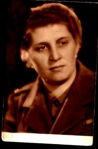 "First, there was the infantry. Then submachine gunners, cannoneers. The mine throwers were somewhere else, they were awaiting the German planes. I was working outside in the field looking for the wounded ones. Sometimes, there was poor wounded soldier covered in ground and screaming. We were not allowed to be walking because the Germans were watching us and were throwing the mines that there was so much light in the sky like during the day. At night there was always an attack. I didn’t know what the war is. We even took cushions with us. The officer asked us: ´ Why are you taking the cushions with you? ´- ´ So we can sleep better. ´ We didn’t sleep for three weeks. When we were in Slovakia, some people wouldn’t even let us use their flats so we could sleep at least for five hours. We had to keep going, because there were injuries all the time. Our troops were approaching and so we had to take care of the wounded soldiers right away. We were on the guard - me, two other girls and two boys. The boys stayed on different position than we had. It was crazy. The Germans were bombing us, we didn’t have enough of the mine throwers. Then during the Christmas time there were no fights. It was quiet. They decided they all are Christians so they will not fight on Christmas. Then all of a sudden the radio began to play some American song. Col. Svoboda said: ´ Oh, boy, this can’t be good. ´ And they started shooting at us."