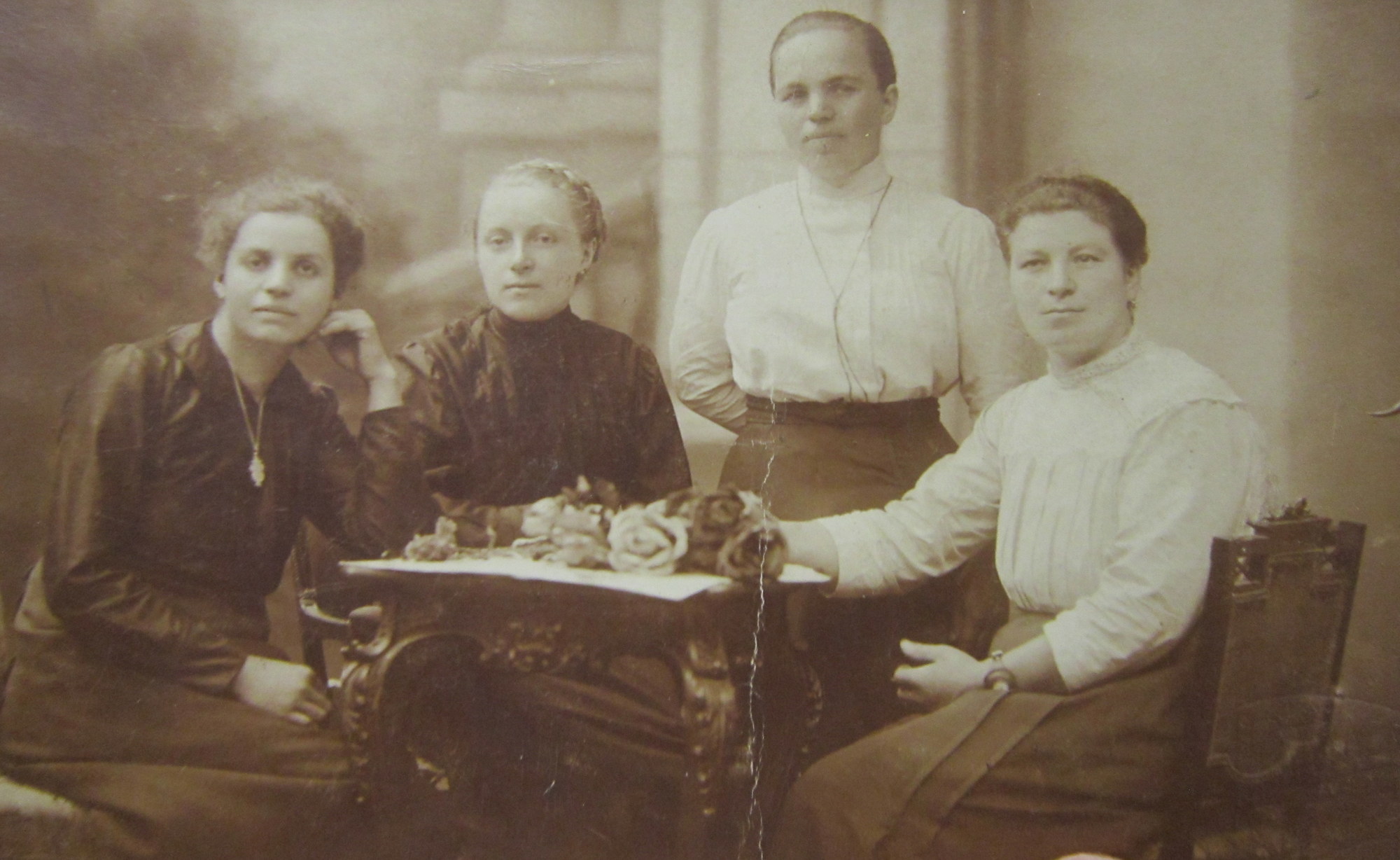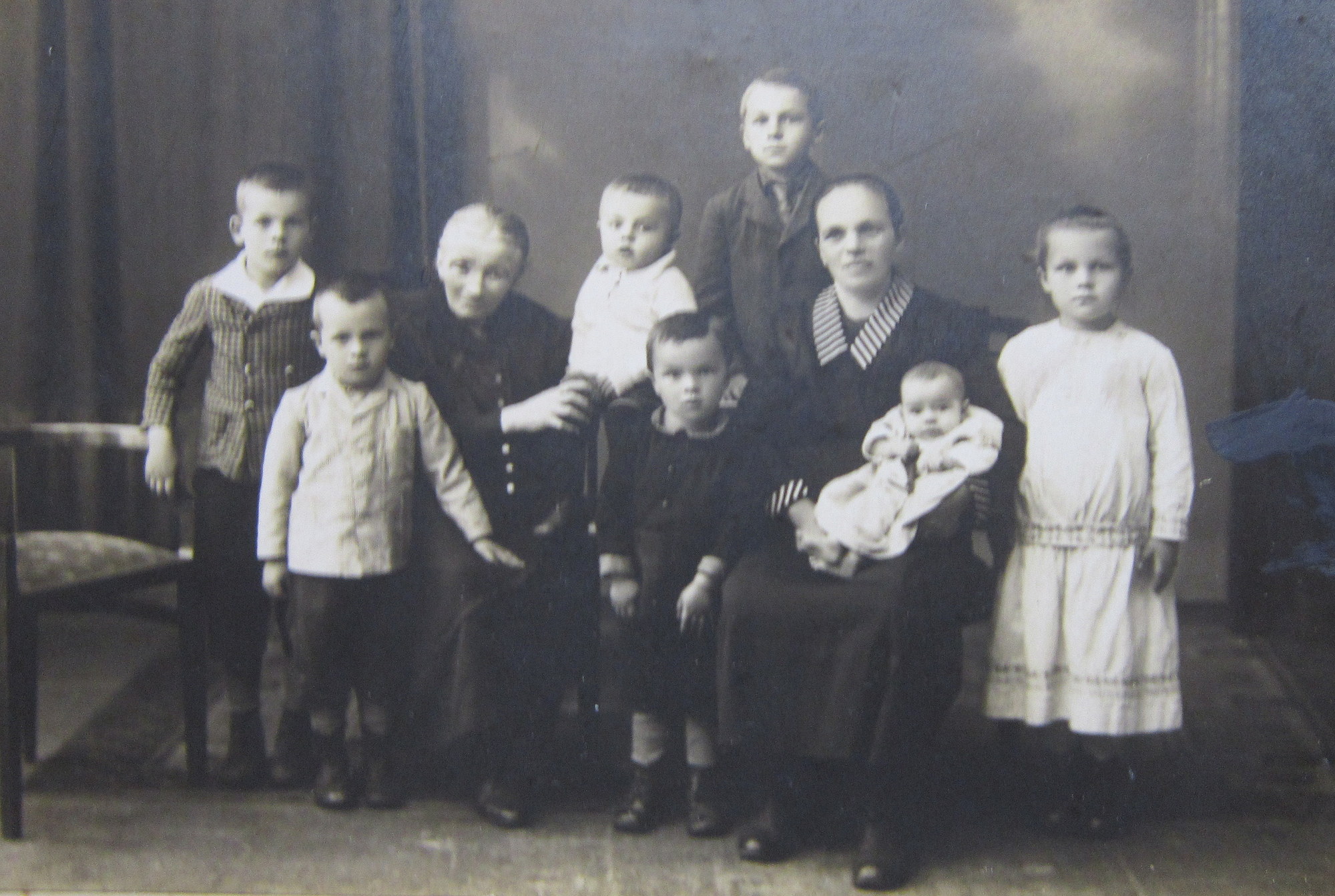 Rodina Pusch - zleva bratr Bernhard, Hubert, babička Marie Freund, bratr Herman, Josef, Johan, matka Marie a sestra Terezie, uplně vpravo pamětnice Marie Filgasová (Pusch)