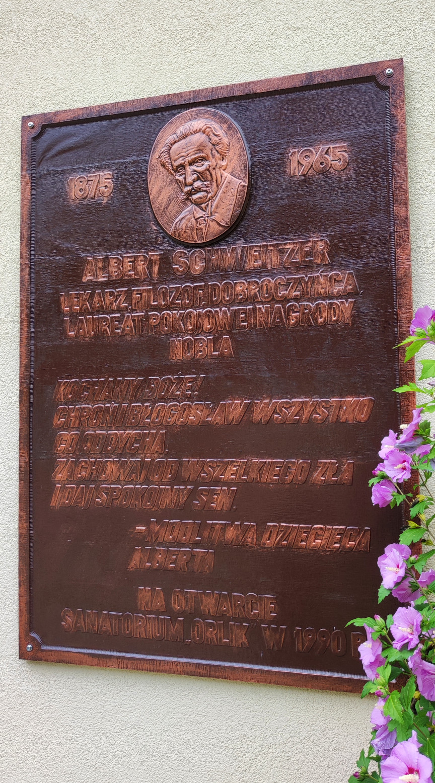 Pamětní deska Albertu Schweitzerovi, kterou Bronislaw Kamiński odhalil při zahájení provozu rekonstruované léčebny pro děti. Francouzský protestantský misionář a lékař pamětníka inspiroval svou myšlenkou bratrství mezi lidmi a národy, za kterou Albert Schweitzer obdržel v roce 1952 Nobelovu cenu za mír. Na pamětní desce je modlitba Alberta Schweitzera pro děti