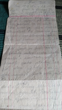 „Oni ho sebrali, našli ho, jako že je přestupnik, že utekl z Německa.“ – „Sebral ho kdo?“ – „Rusové ho sebrali, do ťurmy je posadili, protože utekli, a on psal, abych tam přijela k němu, že dali mu čtyři roky, ťurmu mu nedali, že on je volnej, na čtyři roky. Psal, abych tam přijela, že tam můžu pracovat, že tam můžu krávy dojit, no a tatínek o to nedbal, abych někam jela, a povídá, ona doma krávu nedojí, protože tatínek se bál, byly všelijaké časy, všude bandy a on řekl – nikam ona nepojede. Odbude a přijede. No a já jsem nejela, a tak on si tam vzal jinou ženskou.“