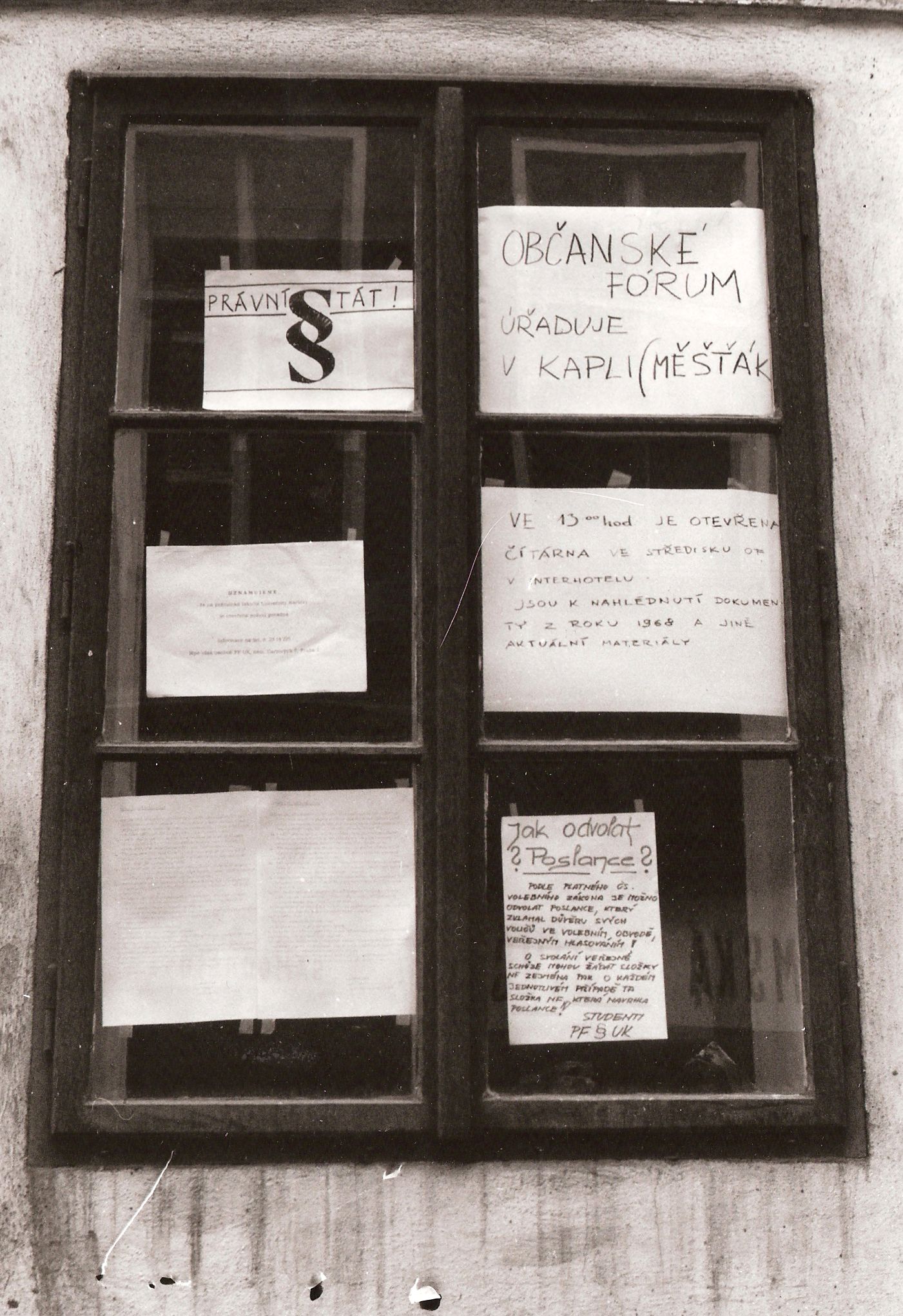 „Já jsem na tom prvním na náměstí byla. Teď už se tomu směju. My jsme se rozhodli, že si uděláme takový ty transparenty na dvě tyčky. Šli jsme po dvojicích a bylo nás osm. Byly jsme čtyři dvojice. Já jsem šla s Mášou Kolmanů. Měli jsme tam napsáno něco jako svobodné volby, nebo tak něco. Já už si ty hesla nepamatuji. Ale myslím, že svobodné volby. Byla to taková ta prostěradla s tyčkami. Aby nás ta patrola nedopadla, protože jsme byli sledovaní, tak jsme to vyráběli u Prokopců v Parkánu. Rozhodli jsme se, že na náměstí nepůjdeme po hlavní, jako po Latránu, ale že půjdeme Parkánem nahoru k divadlu po schodech a Horní ulicí. Tak tam jsme se sešli, bylo nás tedy osm. Měli jsme transparenty. Šli jsme Horní ulicí, my jsme šly s Mášou jako první a volaly jsme: ,Češi pojďte s námi! Pojďte s námi!´ Lidi chodili z práce, byly asi čtyři hodiny. Lidi chodili z práce a různě stáli v Horní ulici. Tu a tam nějaký člověk. A nikdo s námi nešel. My jsme sami došli na náměstí, kde nikdo nebyl a nikdo se nepřidal. Takhle jsme chodili každý den. Už ne s transparenty, ale vždycky ve čtyři hodiny jsme byli na kašně. Někdo se občas přidal a hlouček se začal zvětšovat.“