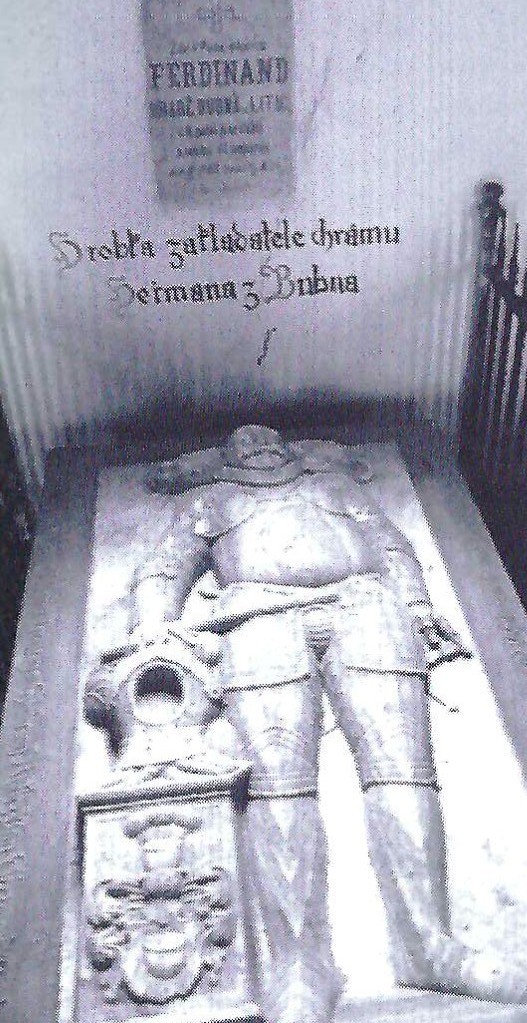 Hermann Bubna-Litic's tombstone with a lion skin under his head in the Holy Trinity Church, Horní Jelení