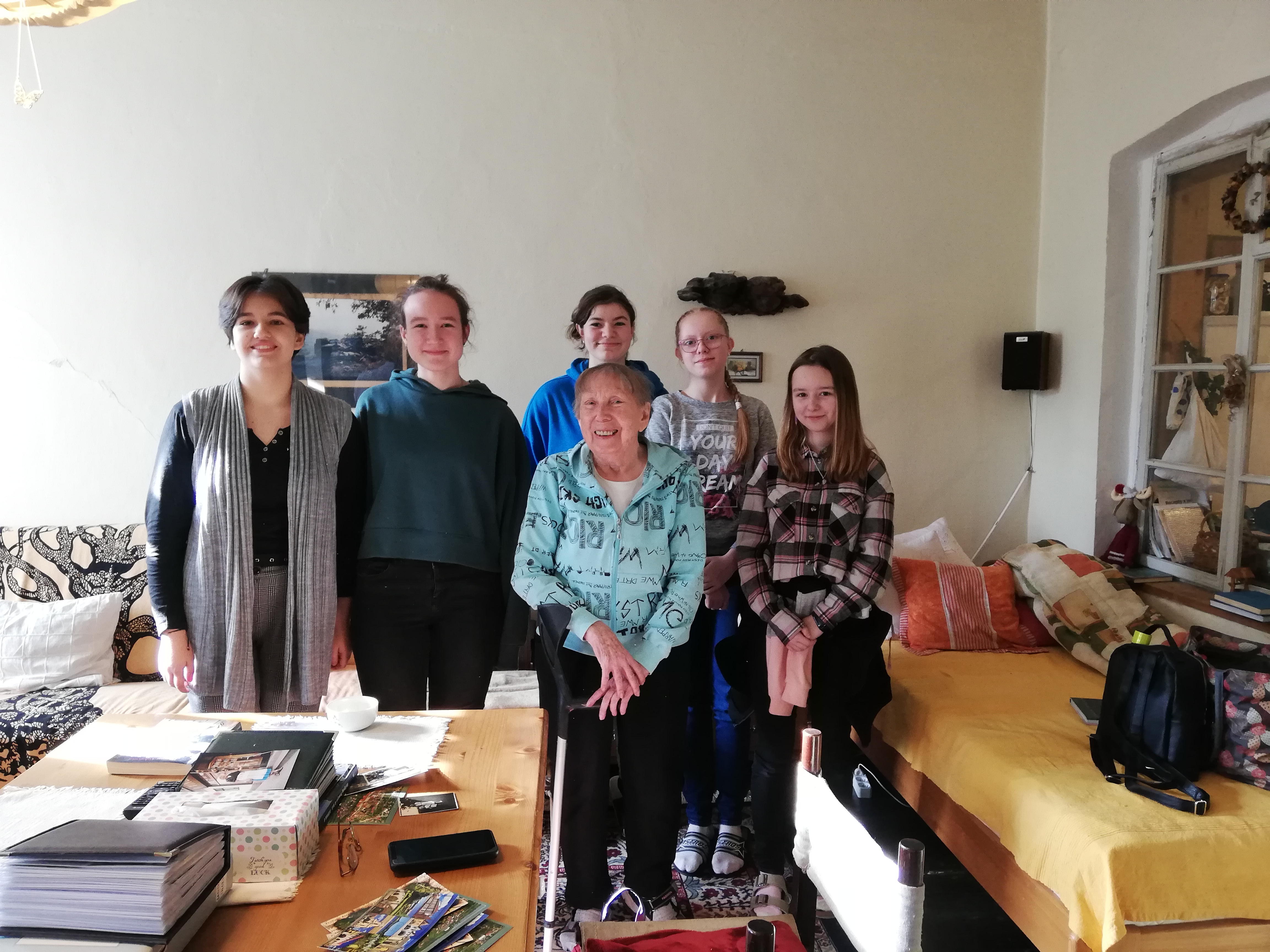 Tým žáků s Ingrid Augstenovou při nahrávání pro projekt Příběhy našich sousedů, 2023