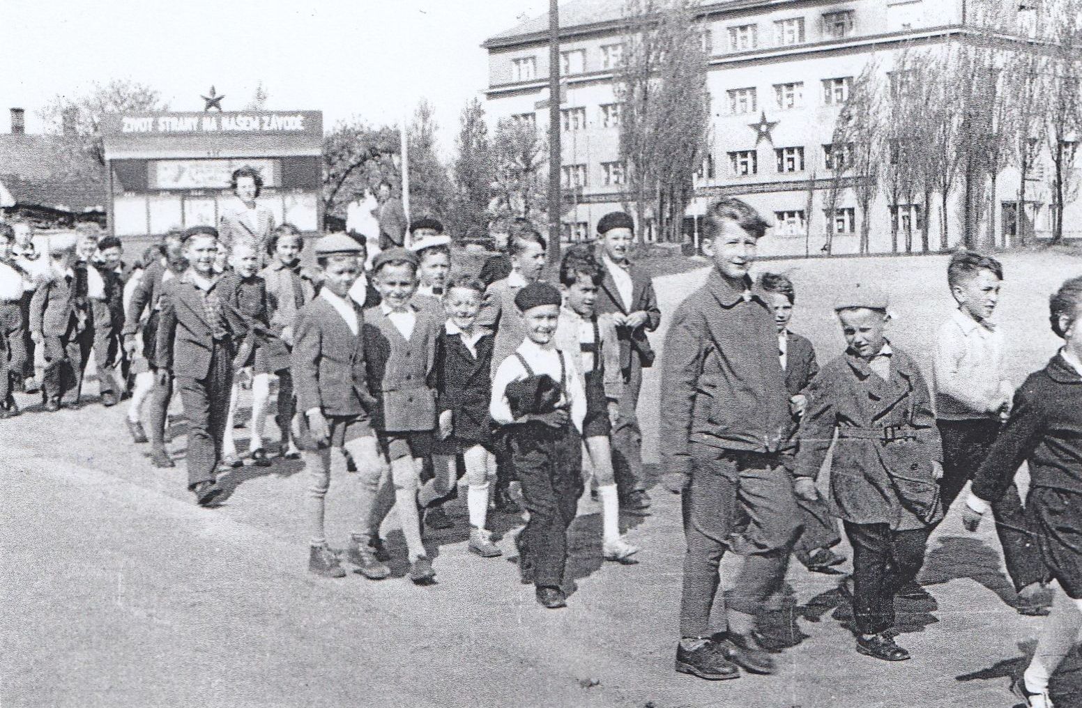 Prvomájový průvod v Českých Velenicích. 50. léta