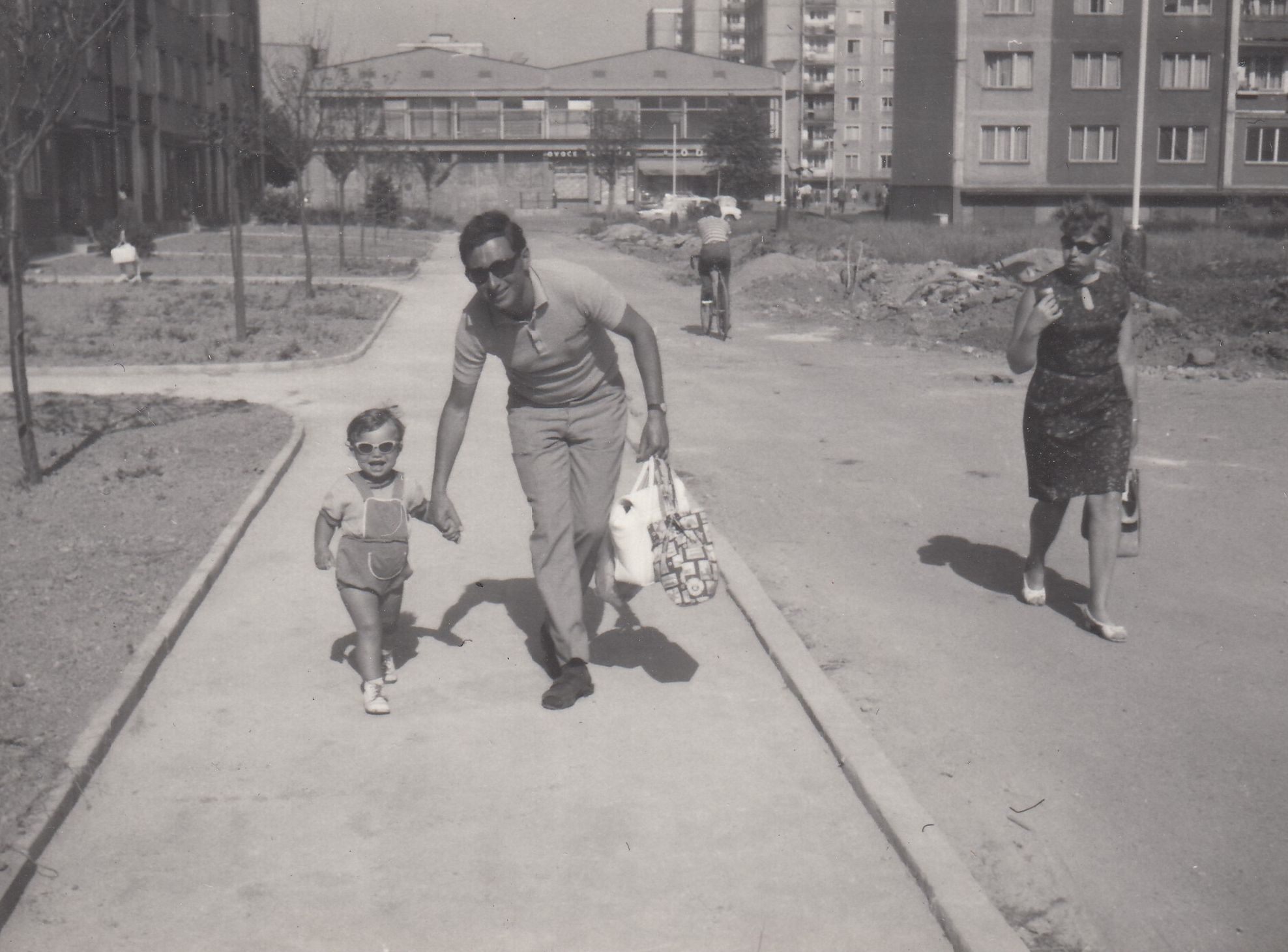 Jiří Podlipný jako malý chlapec se svou maminkou Květoslavou na rozestavěném sídlišti v Tuhnicích v Karlových Varech, na fotografii je v dálce vidět nákupní centrum Meteor